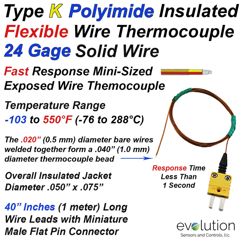 - Wire Leads are 40 inches (3.3ft or 1 meter) long flexible small diameter 24 gage solid in a 2 wire parallel design and individually insulated with Fused Tape Polyimide along with a Polyimide outside jacket.