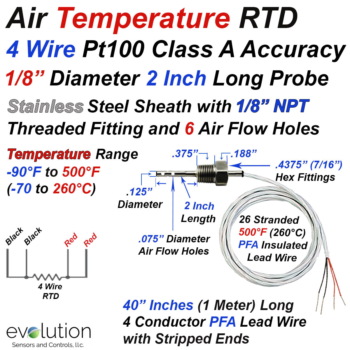 4 Wire Pt100 RTD Probe Air Temperature Probe with Integral 1/8 NPT Fitting on a 1/8” Diameter 2-Inch-Long Probe and 40 Inches of Lead Wire with Stripped Ends.