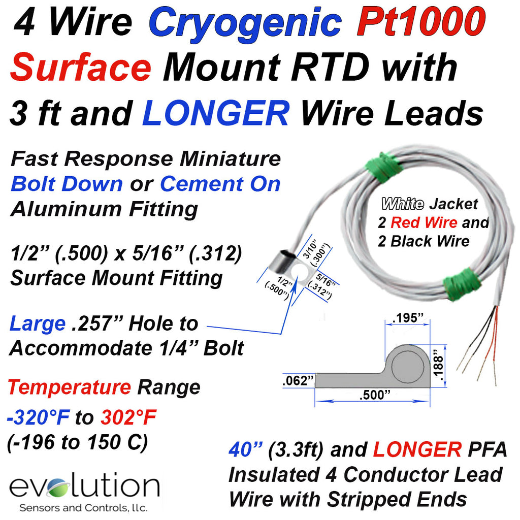 Cryogenic 4 Wire Pt1000 Surface Mount RTD for 1/4" Diameter Bolts with 3ft and LONGER Wire Leads