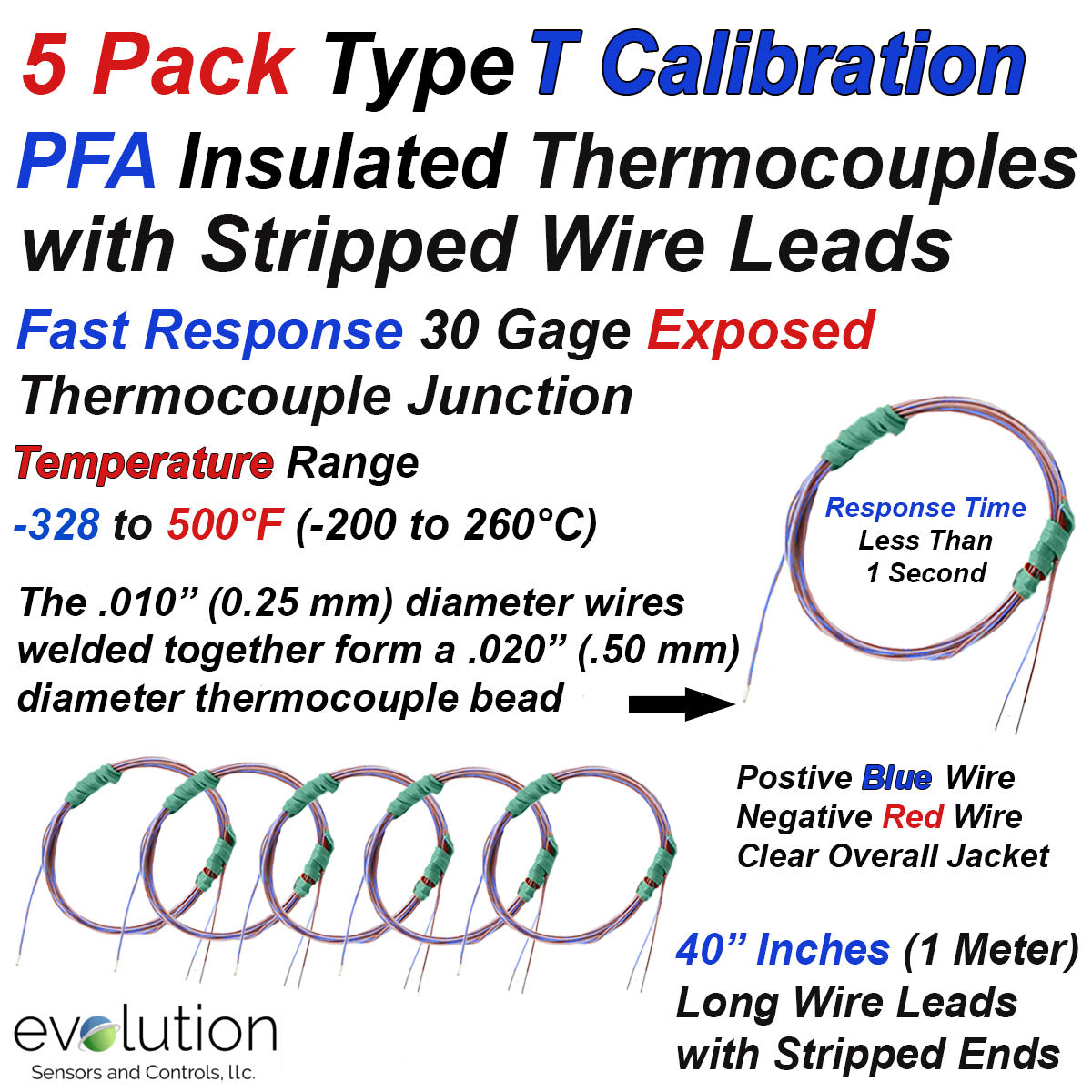 - 5 Pack of Type T thermocouples with an exposed welded bead design made from 40 inches of SLE Accuracy 30 gage PFA (Plastic Fluoropolymer) insulated lead wire with stripped ends.
