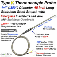 Type K Thermocouple Probe - 48 Inch Long 1/4" Diameter Stainless Steel Sheath Ungrounded with a Transition to 240 Inches of Stainless-Steel Over Braided Fiberglass Insulated Lead Wire with Stripped Ends