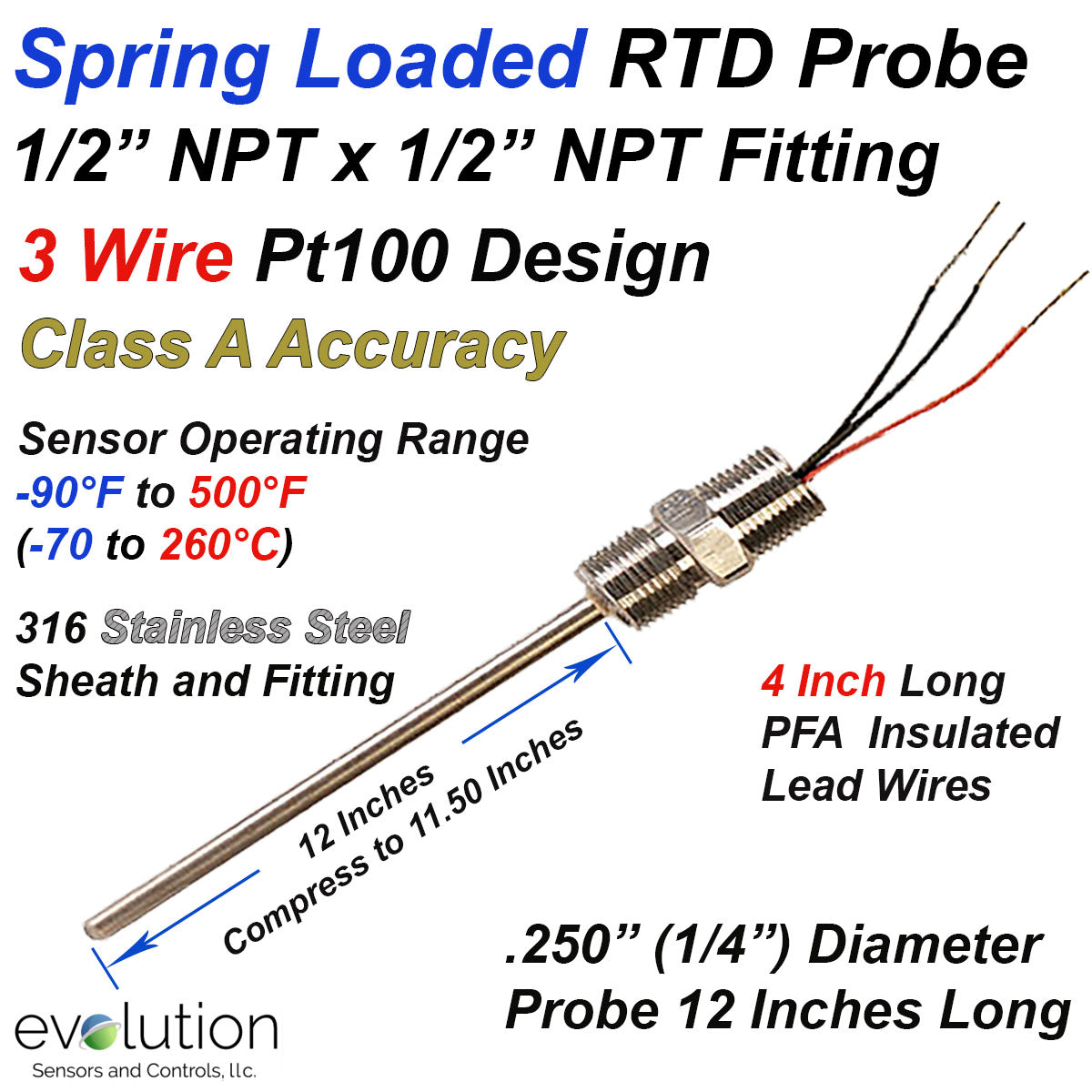 - The RTD is a 12 inch long Spring Loaded Stainless-Steel sheath 1/4" diameter probe with a 1/2" x 1/2" NPT Fitting with PFA Wire Leads.