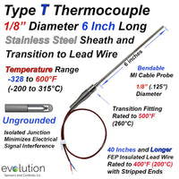 Type K Thermocouple Probe - 6 Inch Long 1/16" Diameter Stainless Steel Sheath Ungrounded and Transition to 40" Inches or up to 120" (10ft) of FEP Lead Wire with Stripped Ends