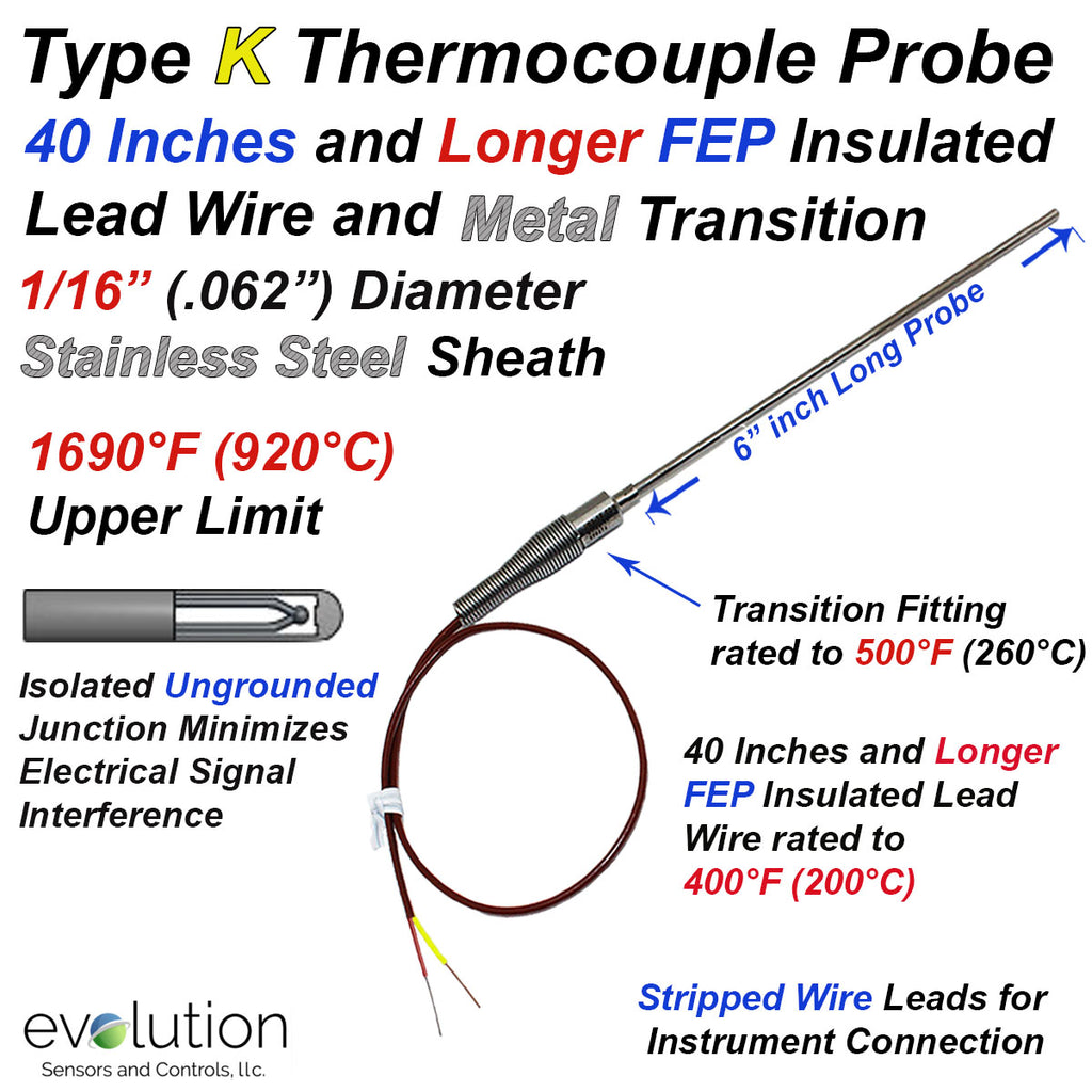 Type K Thermocouple Probe - 6 Inch Long 1/16" Diameter Stainless Steel Sheath Ungrounded and Transition to 40" Inches or up to 120" (10ft) of FEP Lead Wire with Stripped Ends