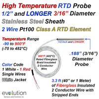 2 Wire Pt100 RTD Probe 1/2 Inch and LONGER x 3/16" Diameter Sheath with Fiberglass Insulated Wire Leads
