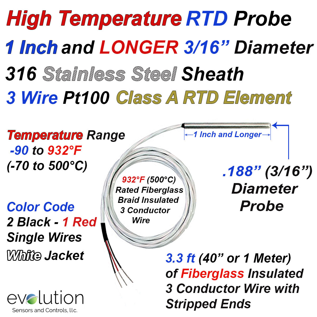 900°F RTD Probe 1 Inch and LONGER 3/16" Diameter Sheath with Fiberglass Insulated Wire Leads