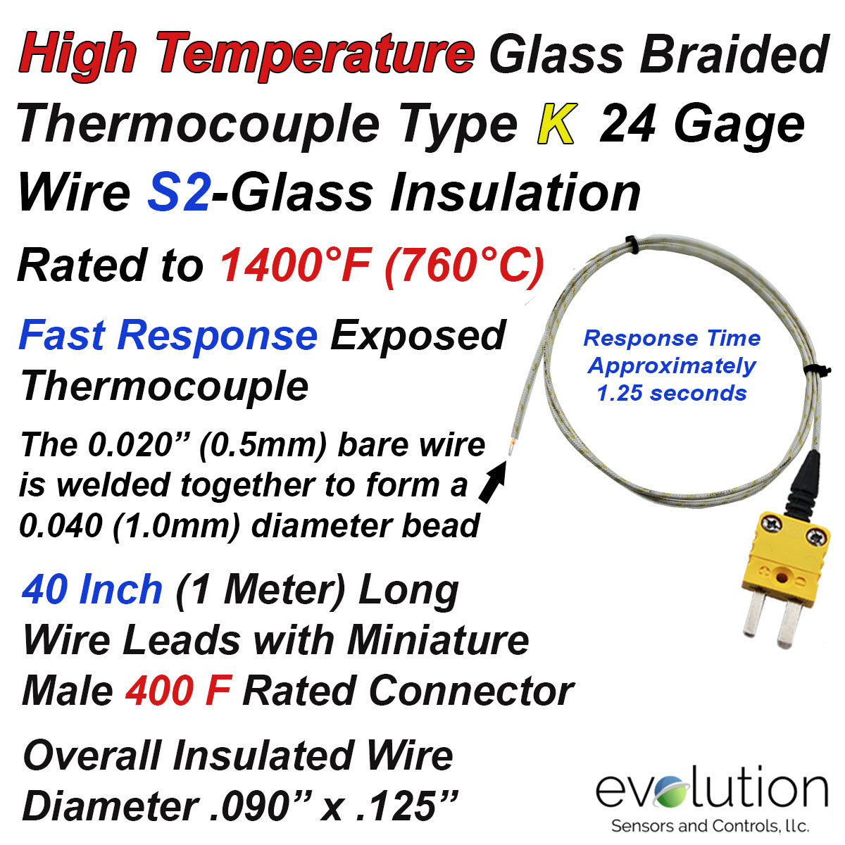 - The Type K thermocouple sensor is an exposed welded bead design made with 40 inches (1 meter) High Accuracy SLE thermocouple grade 24 Gage wire with Fiberglass braided insulation and a miniature male thermocouple connector.