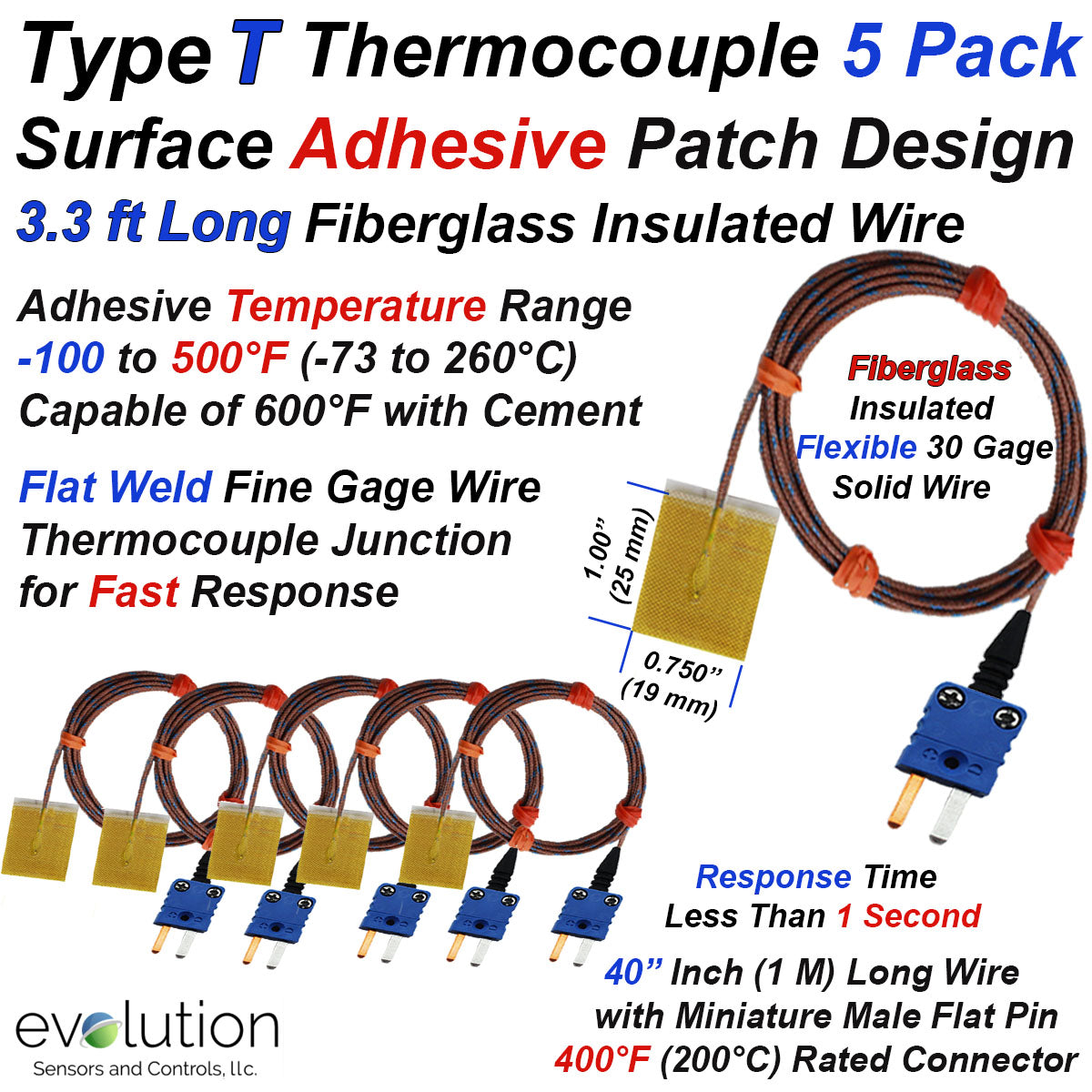 5 Pack of Type T Surface Thermocouples with 40 Inch Long Fiberglass Wire Leads and Miniature Male Connector