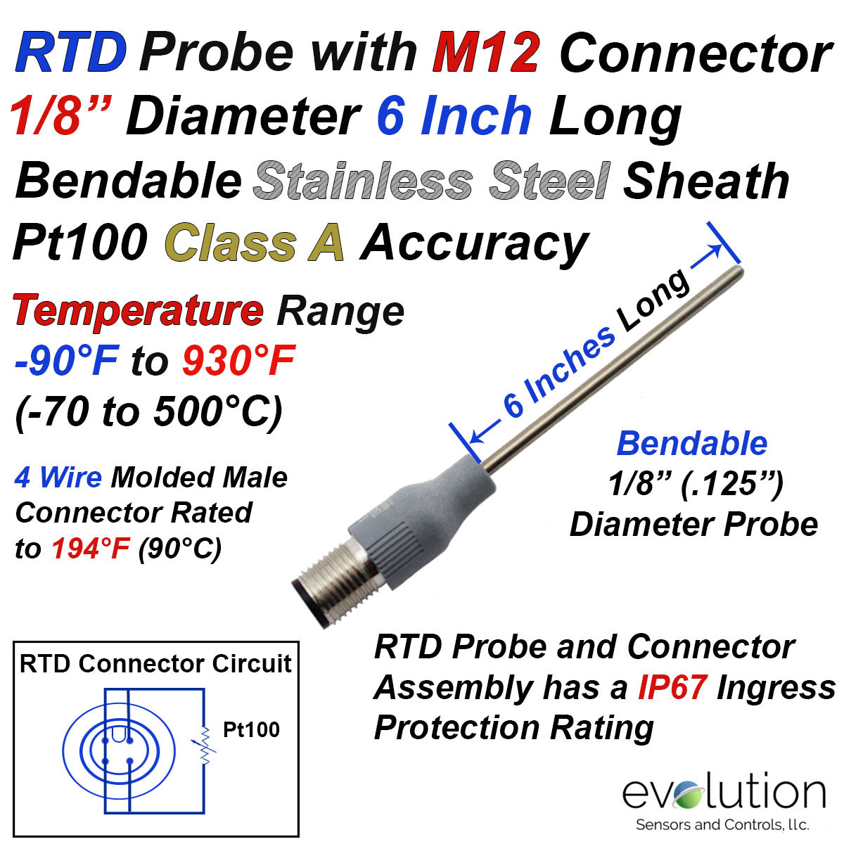 4 Wire Pt100 RTD with 1/8" Diameter 6 Inch Long Stainless Steel Sheath and M12 Molded Circular Connector