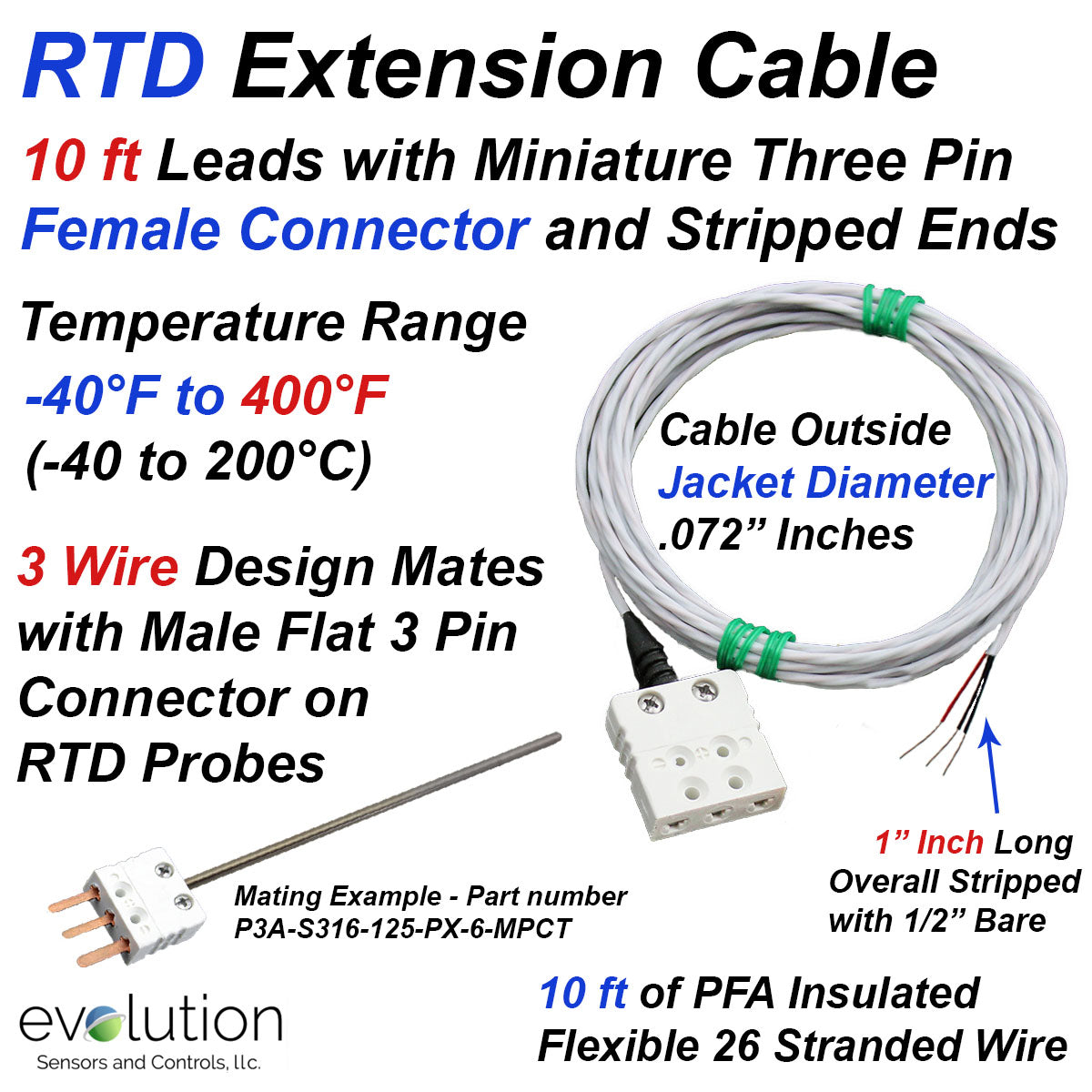 RTD Extension Cable - 4 to 70ft Leads with 3-Pin Flat Miniature Female Connector and Stripped Ends