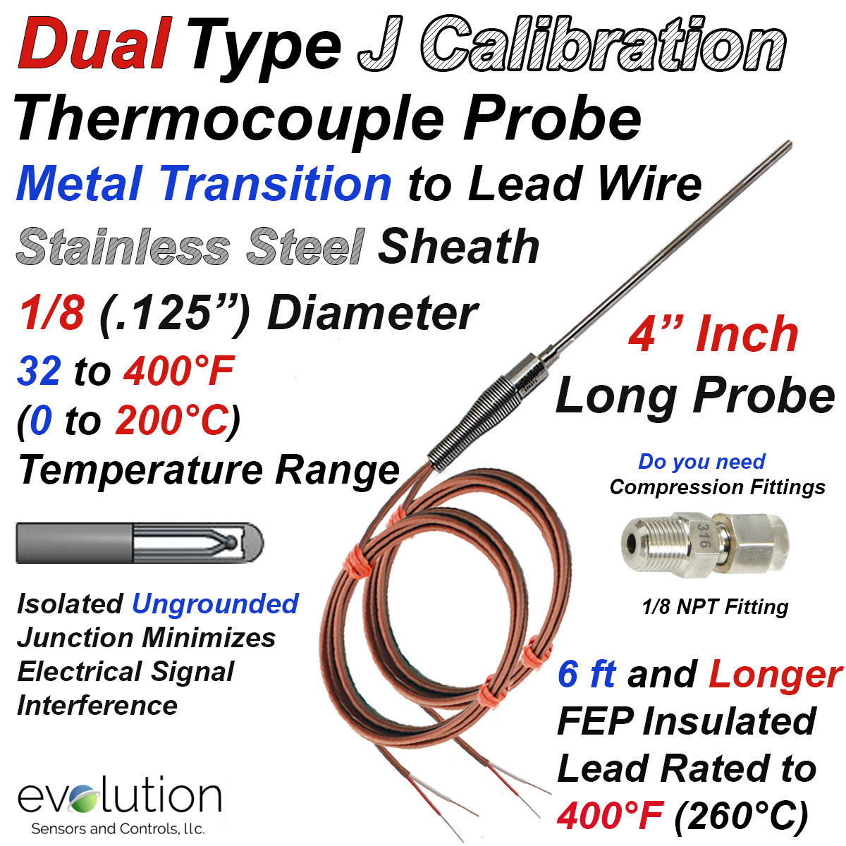 Type J Dual Thermocouple Probe with Transition to Lead Wire - 1/8" Diameter 4 Inch Long Stainless Steel Sheath Ungrounded with 6ft and LONGER Lead Wire