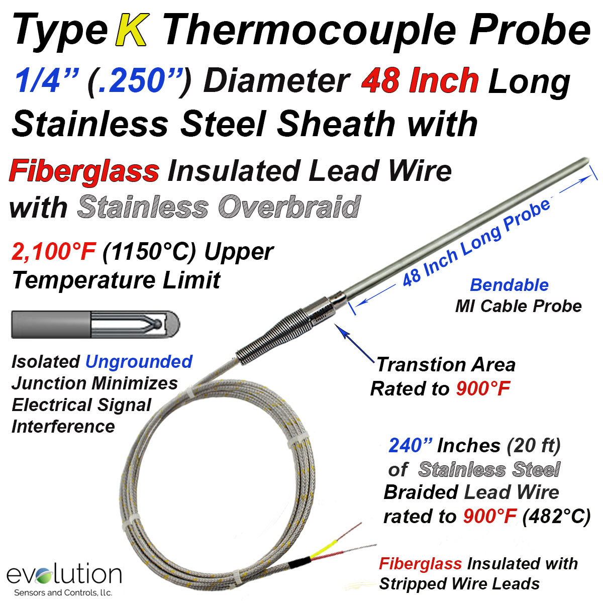 Type K Thermocouple Probe - 48 Inch Long 1/4" Diameter Stainless Steel Sheath Ungrounded with a Transition to 240 Inches (20 ft.) of Stainless-Steel Over Braided Fiberglass Insulated Lead Wire