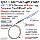 Type K Thermocouple Probe - 48 Inch Long 1/4" Diameter Stainless Steel Sheath Ungrounded with a Transition to 240 Inches of Stainless-Steel Over Braided Fiberglass Insulated Lead Wire with Stripped Ends